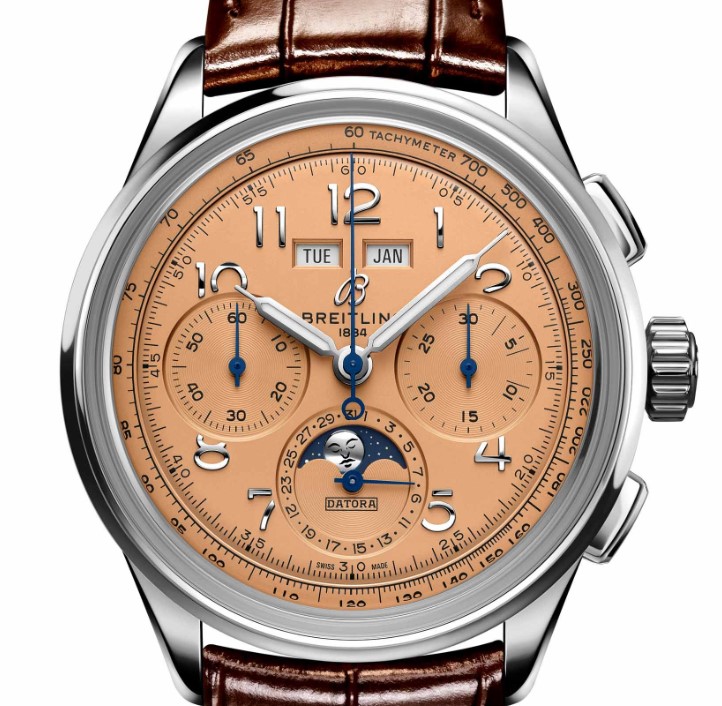 The new Breitling Premier Datora 42 is the most complicated watch in the Premier lineup. As you can see above, the dial contains a lot of information, yet it maintains a clean look. In addition to a standard chronograph with running seconds and 30 minute counter, the watch has a calendar. The lowest sub register houses a moon phase function and date indicator. Additionally, there are day and month windows below 12:00. At this time, Breitling will offer this watch in stainless steel with a copper/salmon dial and in 18K red gold with a silver dial. Both will come on different shades of brown polished alligator straps with folding buckles. Like all the Premier replica watches, these pieces boast 100 meters of water resistance. Size wise, these come in at 42mm in diameter and 15.35mm in thickness.